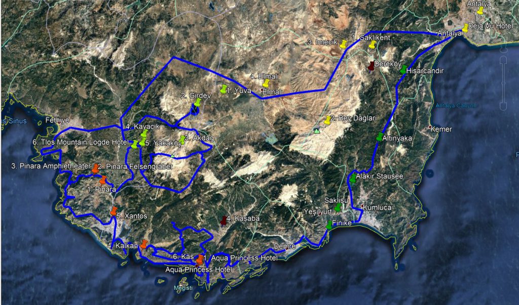 Die heutige Tour führt uns von Tlos über Pinara und Xanthos nach Kas. Wir habe die Felsengräber in Tlos besichtigt und sind dann weiter nach Pinara gefahren. Dort haben wir ein Amphitheater und weitere Felsengräber besichtigt. Mahmut hatte viel über die Geschichte der Lykier zu erzählen. Es macht immer wieder Spaß ihm zuzuhören. Zwischendurch wurde von Mahmut unserem MacGyver noch mal eben ein verbogener Schalthebel repariert. Danach sind wir zu einem Einsiedler, oder Lebenskünstler gefahren. Eigentlich wollten wir dort unsere Mittagspause machen, aber der gute Mann war nicht da und so mussten wir uns mit kalten Getränken behelfen. Spoiler (Stunt 1 von Connor und Stunt 2 vom King) Weiter ging es nach Xanthos der Hauptstadt des Lykischen Bundes. Auch dort hatte Mahmut viel zu erzählen und wir viel zu sehen. Da wir noch nichts gegessen hatten, sind wir nach Kalkan gefahren um dort eine Kleinigkeit zu essen und zu trinken. Anschließend ging es zu unserem Tagesziel nach Kas. Ich war ziemlich erledigt als wir angekommen sind.